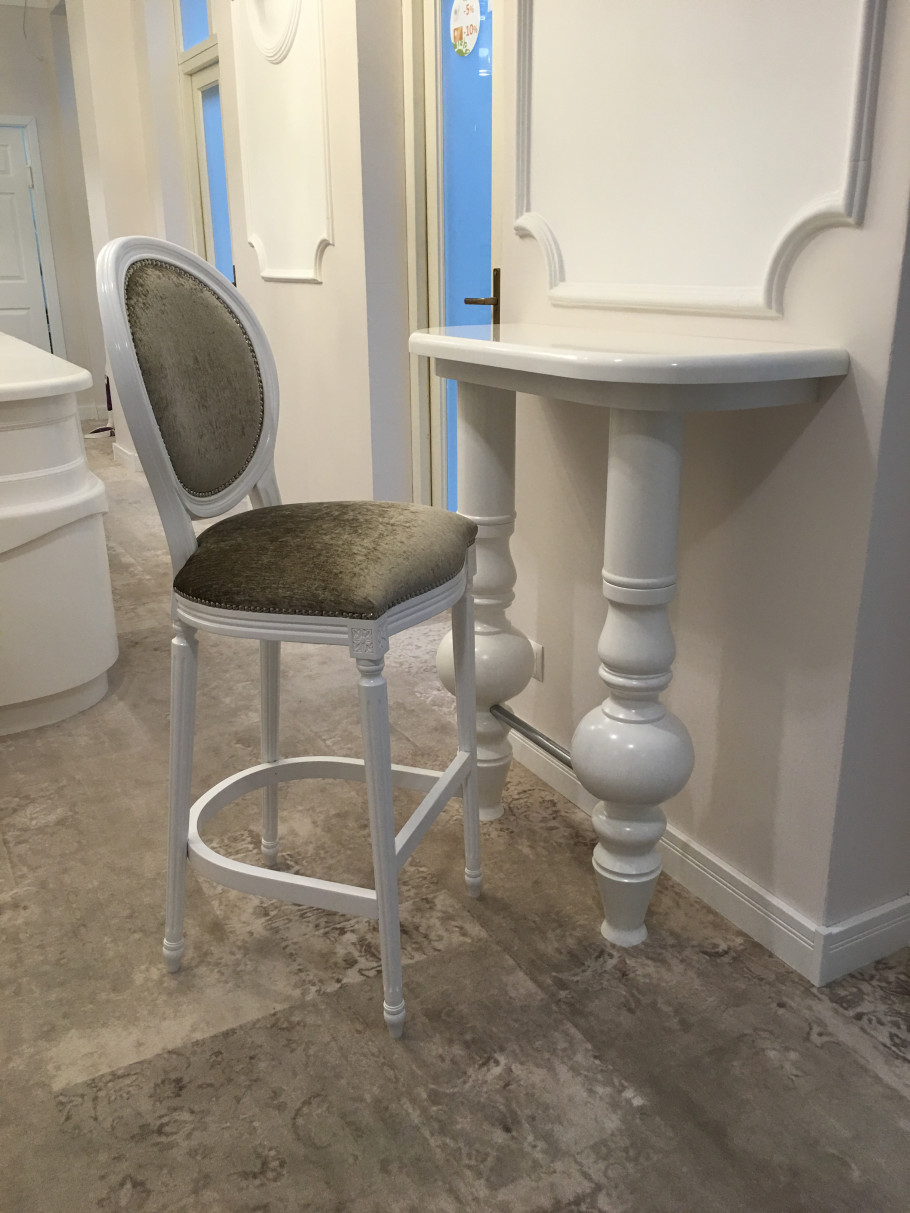 Stylowy hoker tapicerowany Ludwik XVI, dopasowany wysokością do wyspy kuchennej lub baru.
