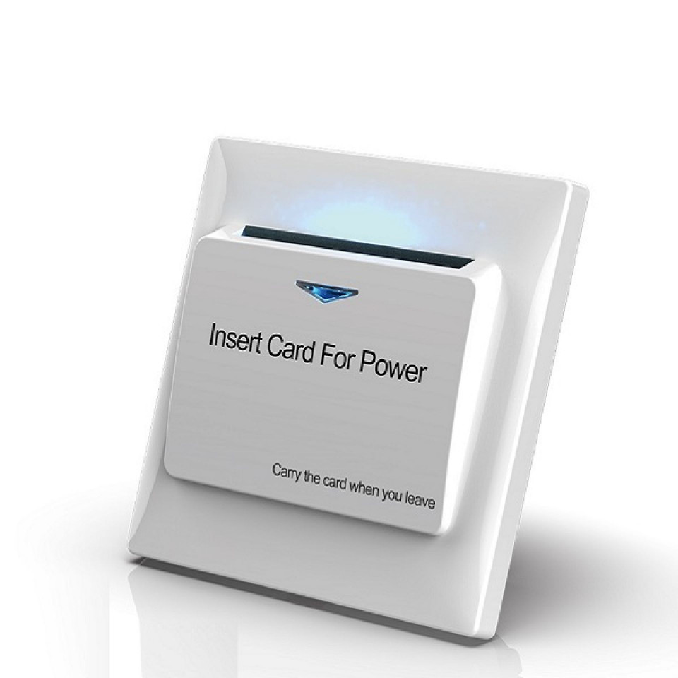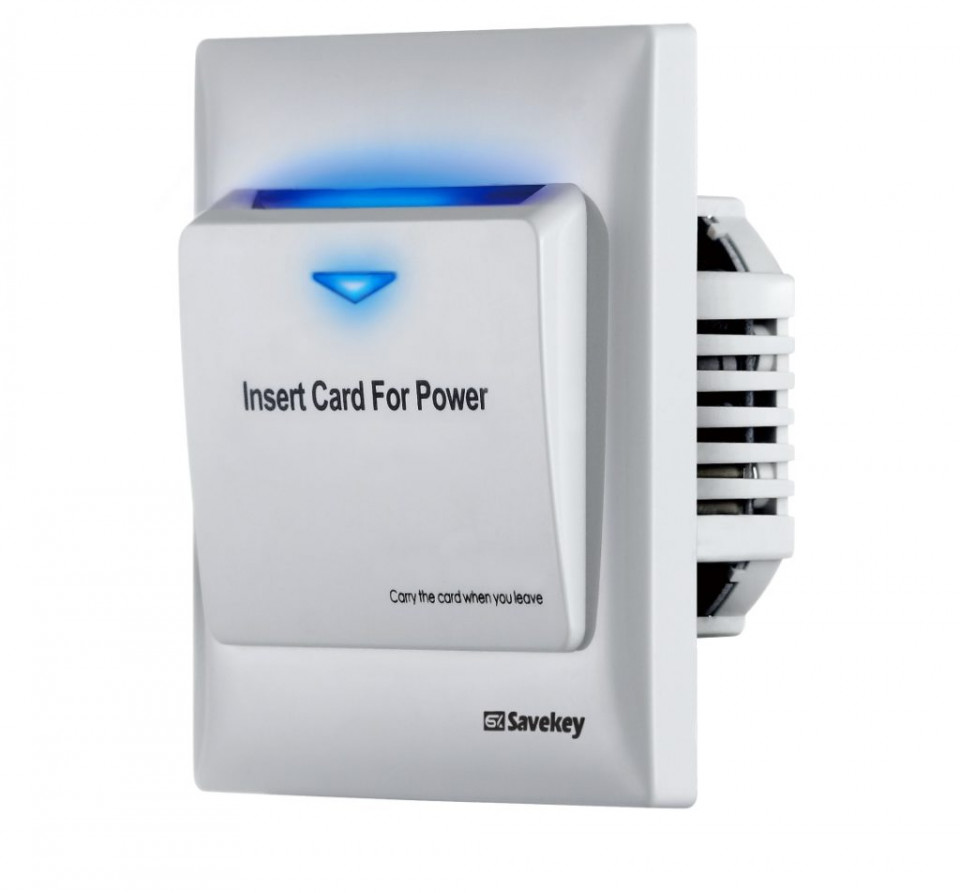 Hotelowe włączniki prądu pozwalają na automatyczne włączenie prądu w pokoju hotelowym po włożeniu do nich karty MiFare i automatyczne wyłączenie po jej wyciągnięciu. Oferowany przez nas włącznik działa jedynie na karty zbliżeniowe MiFare 13,56 MHz - nie ma możliwości uruchomienia go np. wizytówką. Dzięki tej funkcji mamy pewność, że gość wychodząc z pokoju nie zostawi zapalonego światła.