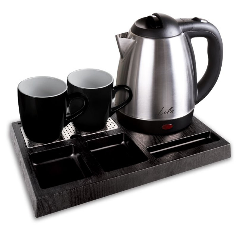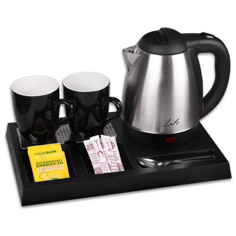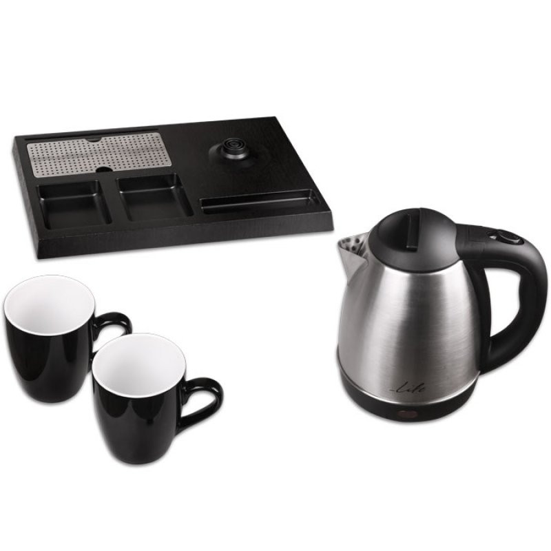 W zestawie znajduje się czajnik o pojemności 1,2 L, taca zintegrowana z podstawą czajnika oraz 2 ceramiczne kubki.