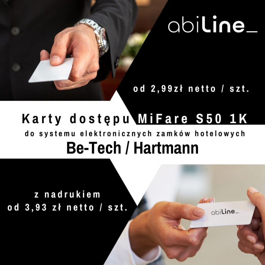 Karty dostępu Mifare 1K S50 kodowane do elektronicznych zamków hotelowych Be-Tech / Hartmann dostępne w cenie od 2,99 zł netoo za sztukę.