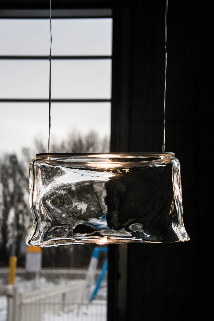 Lampa wykonana tradycyjną metodą hutniczą – szkło ręcznie formowane, rwane, wystrzygane.