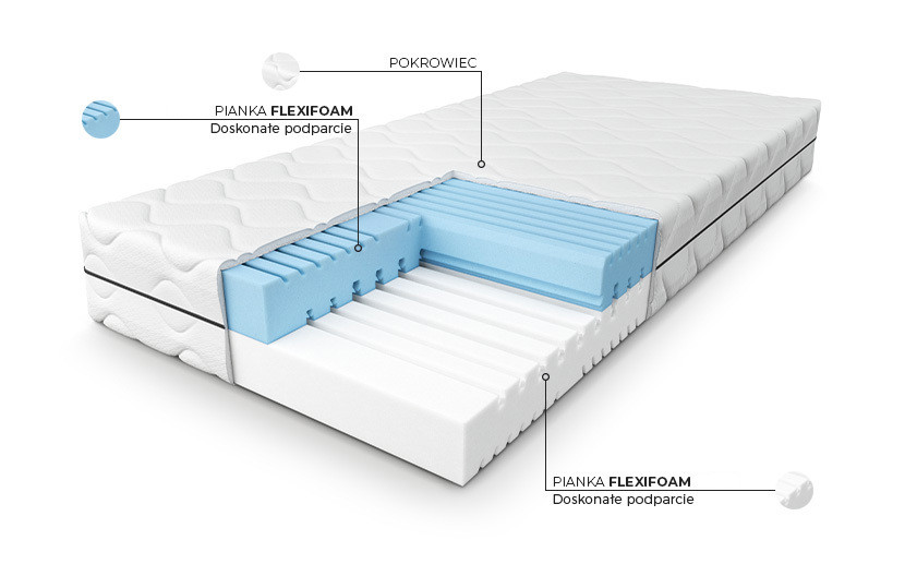 - materac wykonany z dwóch warstw pianki Flexifoam, która wyróżnia się trwałością i elastycznością. Profilowanie komponentu sprawia, że jest on niezwykle higieniczny i sprężysty,