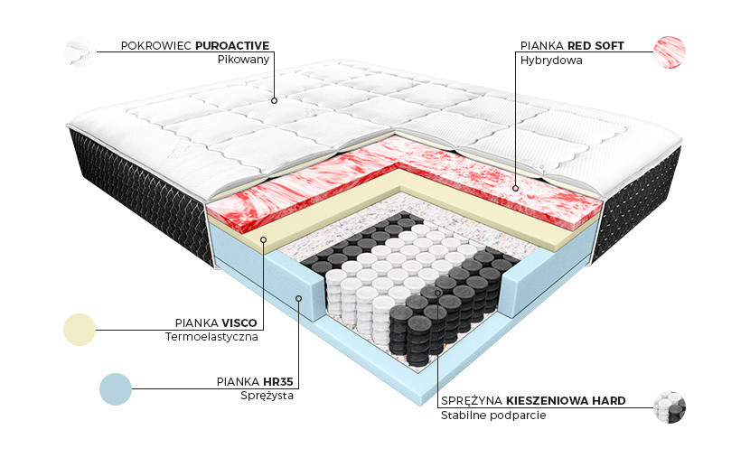 - konstrukcja wzmocniona pianką HR 35, która odprowadza wilgoć z wnętrza materaca,