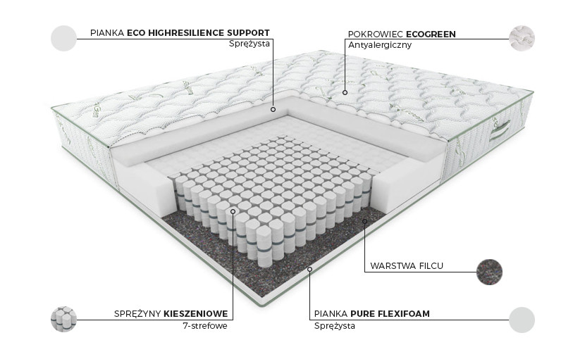 - wkład ze sprężyn kieszeniowych zapewnia wyjątkową sprężystość punktową i perfekcyjne podparcie sylwetki,