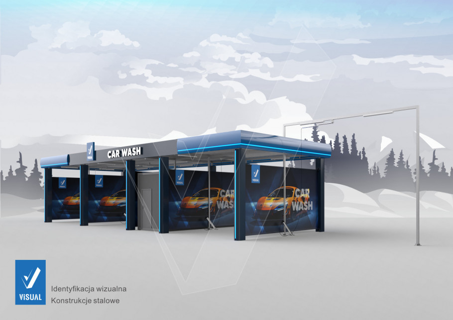 Produkowane przez Visual Sp. z o.o. konstrukcje wiat myjni bezdotykowych wykonane są ze spawanych elementów ocynkowanych ogniowo. Zadaszenie konstrukcji wykonane jest z blachy trapezowej. Zwieńczeniem konstrukcji są elementy reklamowe. Otoki wykonane są z kształtowanej blachy aluminiowej lakierowanej proszkowo lub z płyty kompozytowej typu DIBOND dostępnej w różnych kolorach RAL. Otoki dają nieskończone możliwości ich personalizacji poprzez zastosowanie płaskiej lub przestrzennej grafiki wykonanej z pleksi i podświetlonej przy użyciu technologii z modułów LED. Elementem dodatkowo wyróżniającym obiekt jest zastosowanie podświetlenia obrysowego za pomocą tuby Power LED.
