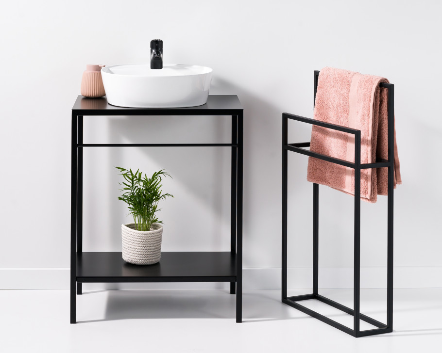 Doskonale minimalistyczna szafka do łazienki w stylu skandynawskim, loftowym, klasycznym. To piękny i praktyczny element wystroju wnętrza, który kontrastuje z resztą wyposażenia i upodabnia łazienkę do eleganckiego pokoju kąpielowego. Niewielkich rozmiarów półka umiejscowiona poniżej górnego blatu pozwala na przechowywanie mniej lub bardziej potrzebnych drobiazgów lub ręczników. Nowoczesna szafka pod umywalkę wykonana została z metalu malowanego proszkowo. W cenie konsoli pod umywalkę zawarte jest wycięcie otworu pod umywalkę, średnica i usytuowanie otworu do ustalenie przy realizacji zamówienia. Meble ręcznie robione, doskonałe do nowoczesnych wnętrz. Modele dla projektantów w zakładce: https://decosteel.pl/do-pobrania/