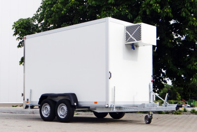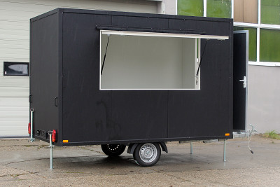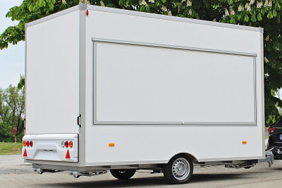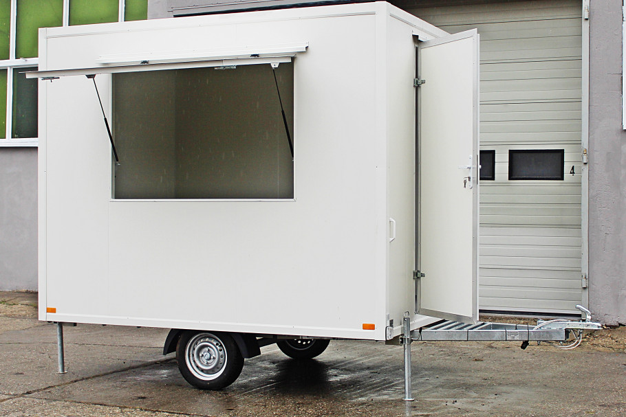 Jest to przyczepa, która posiada w standardzie jedno okno sprzedażowe po prawej stronie oraz drzwi wejściowe umieszczone po stronie dyszla.