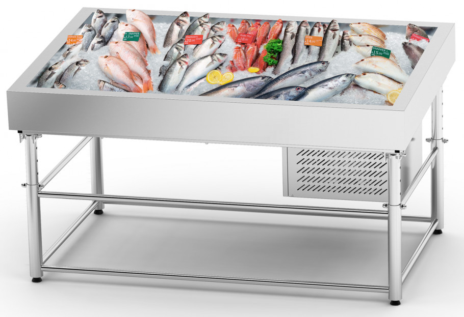 Lada chłodnicza do ekspozycji ryb w lodzie - to regulowany stół składający się ze spawanej ramy oraz wanny. Środek witryny, strona zewnętrzna i rama są wykonane z wysokiej jakości stali nierdzewnej, co zapewnia praktyczność w użytkowaniu i pielęgnacji. Regulowana wysokość frontu i części tyłnej, regulacja kąta nachylenia górnej powierzchni - 3° oraz blat zapewniają możliwość przystosowywania stołu do konkretnych potrzeb. Konstrukcja stołu wzmocniona poprzez profile, na których znajduje się sprężarka. Witryna wyposażona w agregat chłodniczy. Chłodzenie blatu odbywa się na całej powierzchni ekspozycyjnej stołu, w tym dzięki skutecznej warstwie termoizolacyjnej. Małe zużycie energii. Podwójne dno ułatwia odprowadzanie wody ze stopionego lodu: górny blat jest perforowany (kratki zdejmowane), a wylewka do podłączenia do instalacji kanalizacyjnej umieszczona jest w dolnym - pod wanną.