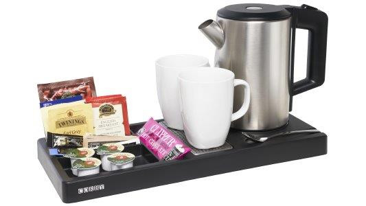 Eleganckie rozwiązanie do pokoju hotelowego. Produkt składa się z tacy i czajnika 1 l.