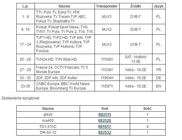 Poniżej przedstawiono zestawienie sprzętowe niezbędne do realizacji stacji czołowej TERRA umożliwiającej odbiór 24 programów wchodzących w skład 3 multipleksów naziemnej telewizji cyfrowej DVB-T oraz 11 programów satelitarnych DVB-S/S2 w standardzie DVB-T COFDM.